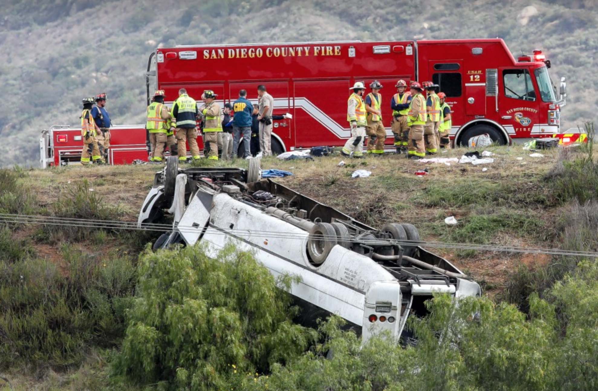 It was raining when the bus suddenly swerved and lost control in the southbound lanes of the freeway, just south of state Route 76. The bus had veered off the 15 Fwy in rainy conditions rolling over and down the embankment. The vehicle slid down an embankment and landed on its roof. The North County Fire Protection District said the crash happened just south of Highway 76, ejecting multiple passengers from the vehicle. Firefighters rescued several others who were trapped and injured inside the bus. None of the decedents are children.